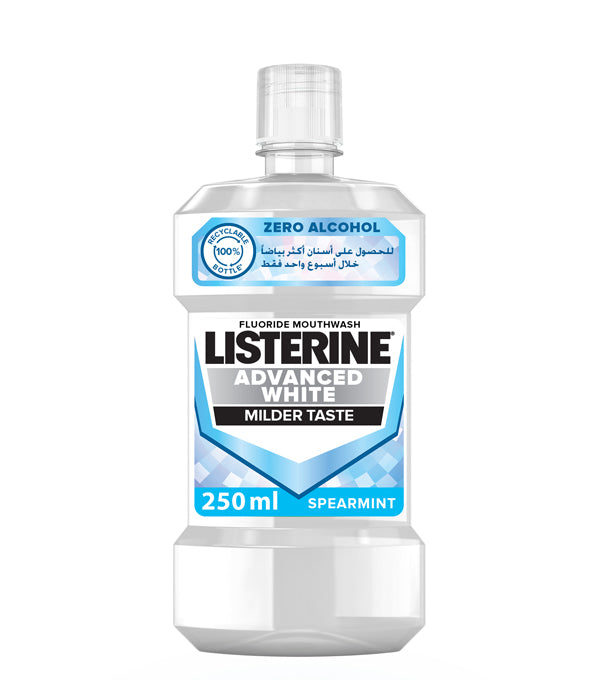 LISTERINE® Advanced White Milder Taste is a ZERO-ALCOHOL formula clinically proven to help give you whiter teeth in just 1 week*. Powerful Essential Oils help kill 99% of germs that cause plaque. With non-abrasive whitening technology that does not harm the enamel Forms a protective shield to help prevent future stains. With fluoride to remineralise and strengthen teeth. Proven to lift and prevent tough stains