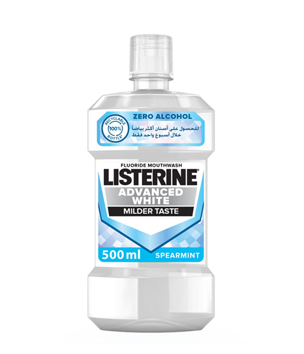 LISTERINE® Advanced White Milder Taste is a ZERO-ALCOHOL formula clinically proven to help give you whiter teeth in just 1 week*. Powerful Essential Oils help kill 99% of germs that cause plaque. With non-abrasive whitening technology that does not harm the enamel Forms a protective shield to help prevent future stains. With fluoride to remineralise and strengthen teeth. Proven to lift and prevent tough stains